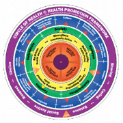 There are many factors to consider when determining a person’s overall health: employment, income, education level, daily habits, physical activity, air quality, economic inequality, racism, etc. The Circle of Health© serves as a tangible framework, providing a visual representation of the multiple internal and external factors that affect our health. It is a handheld tool with moveable rings that link values, the Ottawa Charter, social theory, determinants of health, and the ancient wisdom of Indigenous cultures through the inclusion of the Aboriginal medicine wheel. It encourages a values-based and systematic approach to research, planning, and evaluation.